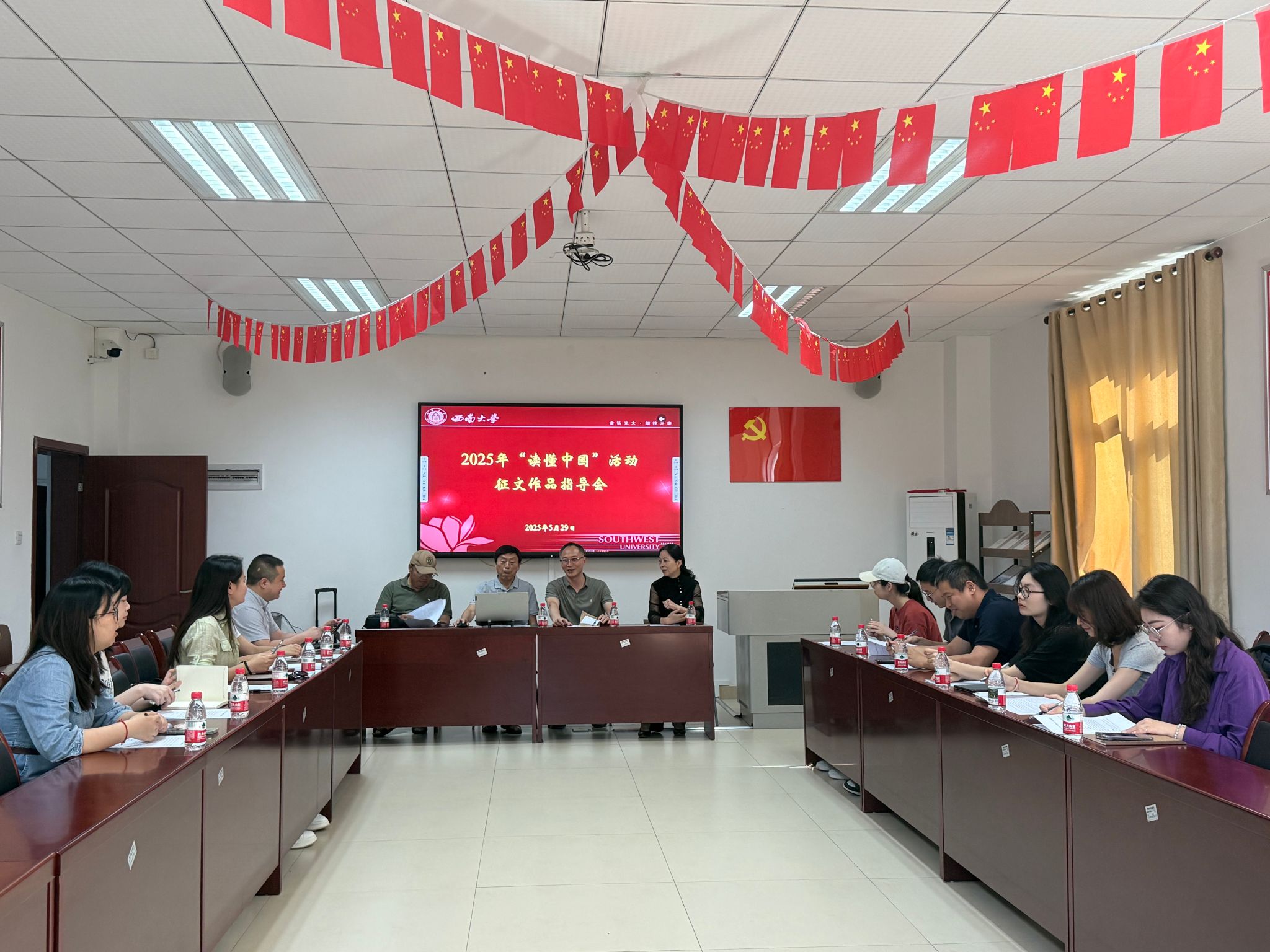 5月29日上午,学校关工委召开了2025年“读懂中国”活动征文作品指导会。相关作品作者、指导老师、征文指导专家及离退休工作处相关领导和工作人员参会,会议由离退休党委副书记熊伟主持。会上,离退休工作处处长鲁森介绍了2025年“读懂中国”活动总体工作开展情况。本次活动各二级关工委积极组织,共收到申报作品项目50个,经专家组严格评审,最终选出5个最具潜力的征文作品,学校关工委安排专家点对点进行指导。他强调,“读懂...