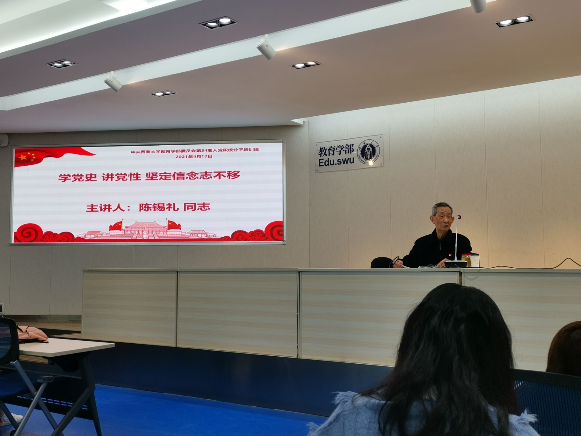 陈锡礼同志以“学党史,强党性,坚定信念志不移”为题向教育学部的学生党员和入党积极分子讲述了身边的党史故事,他从自己身边最熟悉的事情讲起,带领学生一起回顾了国家建设发展的历程,并希望入党积极分子认真学习党史,积极向党组织靠拢,做到个体与时代的统一。