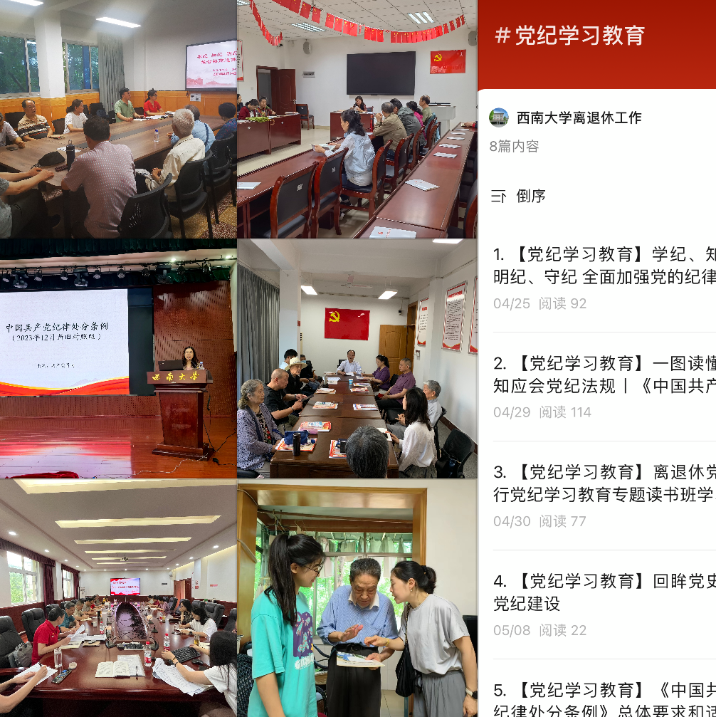 为推动党纪学习教育融入日常、抓在经常,离退休党委根据中共教育部党组、重庆市委老干局关于开展党纪学习教育的相关部署,按照《中共bw必威西汉姆联官网委员会关于印发〈中共bw必威西汉姆联官网委员会党纪学习教育工作方案〉的通知》(西委〔2024〕27号)要求,结合离退休工作实际,多措并举,扎实推动党纪学习教育走深走实。