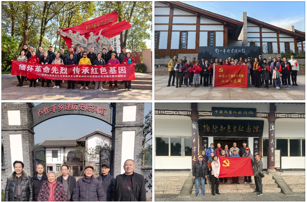 此外,为丰富学习形式,增加支部凝聚力,部分党支部组织党员前往陶行知先生纪念馆、邓小平故居陈列馆、川陕革命根据地红军烈士陵园等地开展实地研学。在邓小平故居陈列馆,大家重温了中国改革开放总设计师波澜壮阔的革命生涯和卓越贡献;在陶行知先生纪念馆,老同志们深切感悟“捧着一颗心来,不带半根草去”的教育家情怀和奉献精神;在庄严肃穆的川陕革命根据地红军烈士陵园,老同志们缅怀革命先烈的丰功伟绩,接受了一次深刻的党性教育和精神洗礼。通过踏寻革命足迹,瞻仰先贤风范,老同志们进一步坚定了理想信念,筑牢了初心使命。