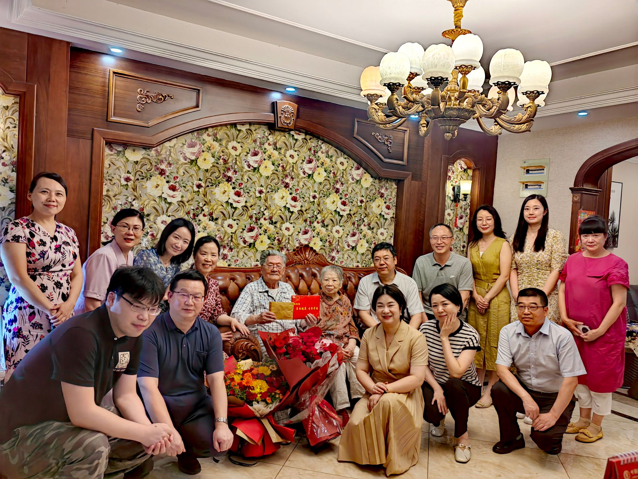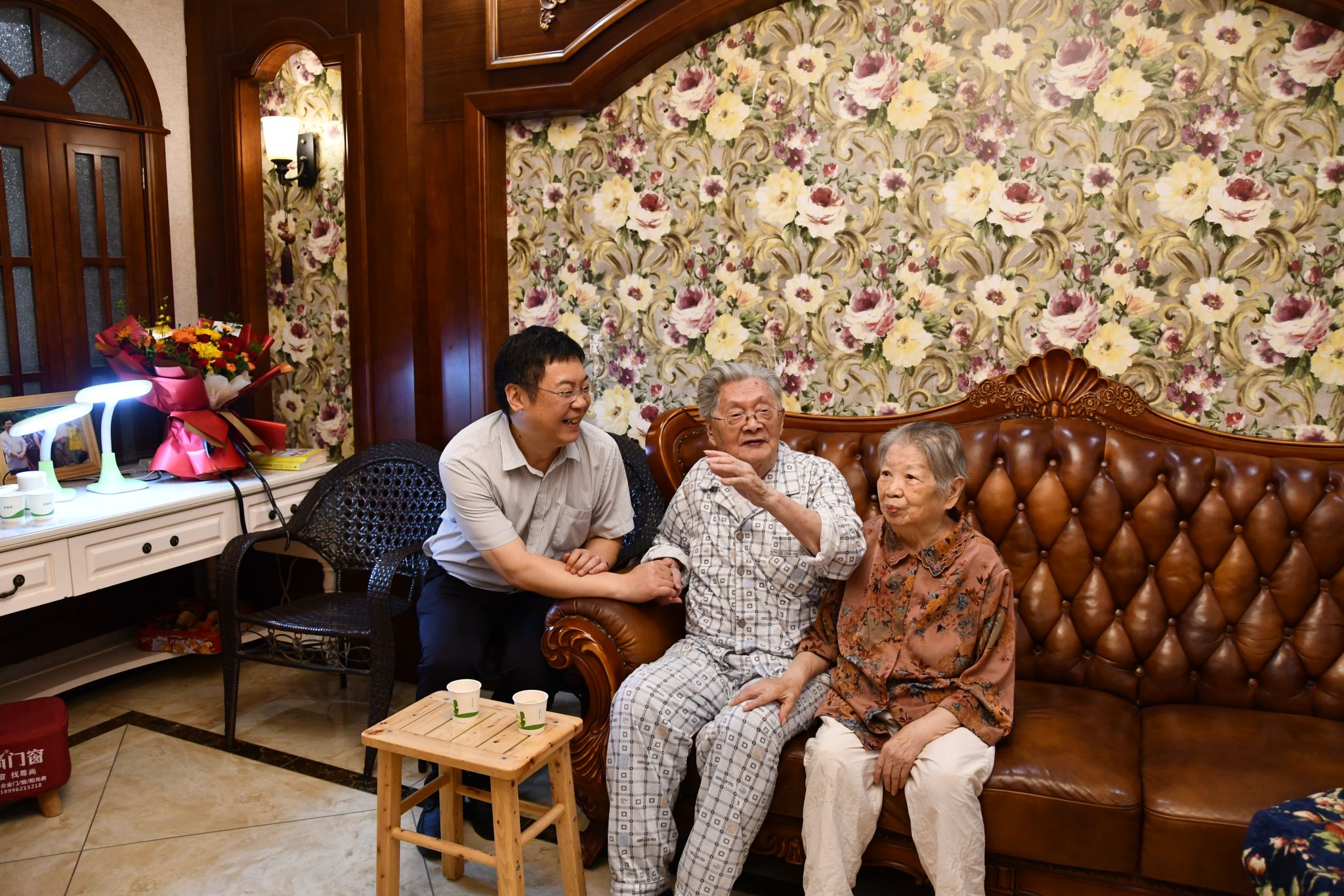 在徐炳旸家中,武好明代表学校送上鲜花等,详细询问老人身体状况和日常起居情况,感谢他为学校事业发展做出的贡献,祝福老人生活幸福、健康长寿。
