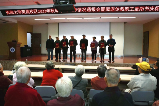 会上为获得2023年荣昌区首批健康老人称号的六位荣昌校区老同志举行了证书颁发仪式,激发离退休老同志经常参与健身活动,健康养老,不断提升离退休老同志的获得感、幸福感、安全感。