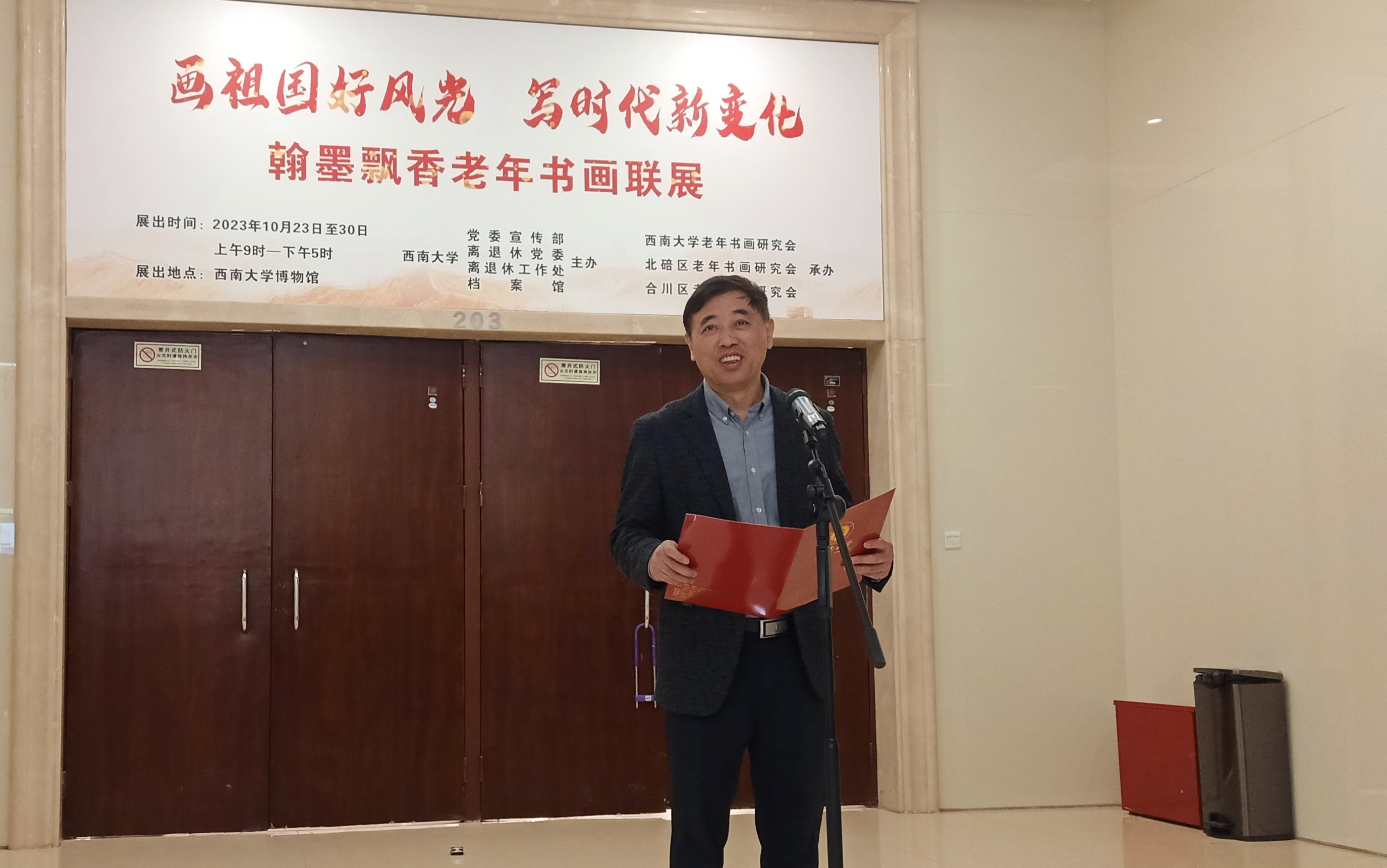 天朗气清,惠风和畅,正是橙黄桔绿的人间好时节。为欢庆2023年老年节,由bw必威西汉姆联官网党委宣传部、党委网络工作部,离退休党委、离退休工作处,档案馆、校史馆、博物馆主办,bw必威西汉姆联官网、北碚区、合川区老年书画研究会承办的“画祖国好风光 写时代新变化”老年书画作品联展,于2023年10月23日上午在学校博物馆隆重开幕。学校党委副书记潘洵出席开幕式并讲话。离退休党委书记李红主持开幕式。相关职能部门、学院领导,bw必威西汉姆联官网、北碚区、合川区老年书画研究会负责人、会员及师生代表共60余人参加开幕式。