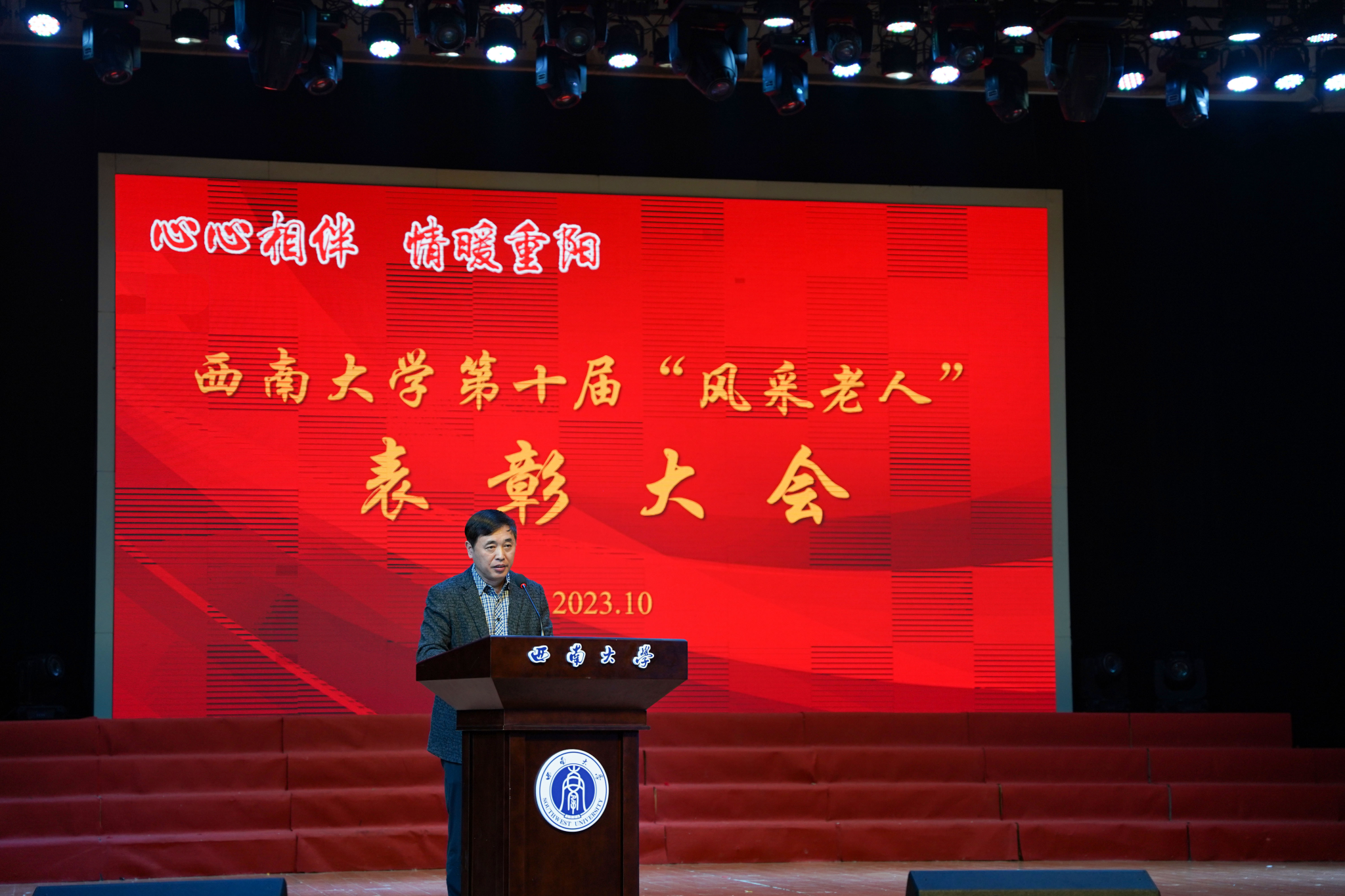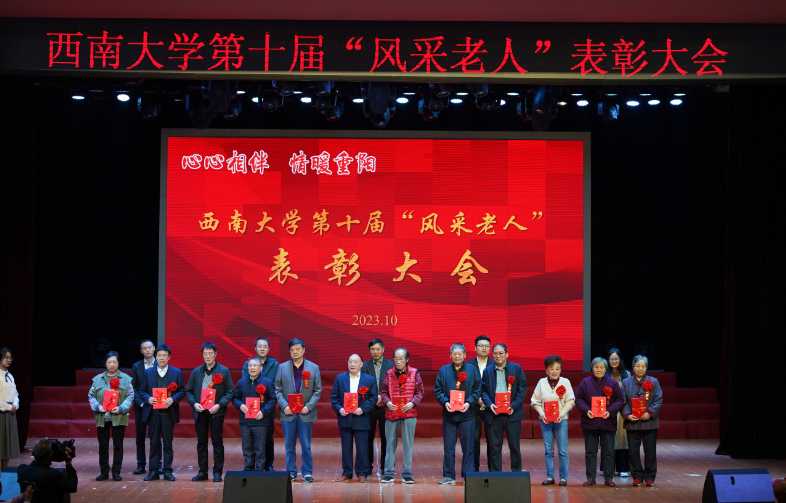 舞动芳华金秋时,情暖桑榆庆佳节。为欢庆老年节,表彰先进,激励引导广大老同志积极向上,健康生活,乐享幸福晚年。10月26日,学校举行第十届“风采老人”表彰大会暨庆祝老年节文艺演出。学校党委副书记潘洵出席并讲话。离退休工作处处长廖万洪主持表彰大会。学校党政办、组织部、人力资源部、离退休党委、离退休工作处负责人,以及受表彰老同志、离退休教职工代表共计600多人参加。