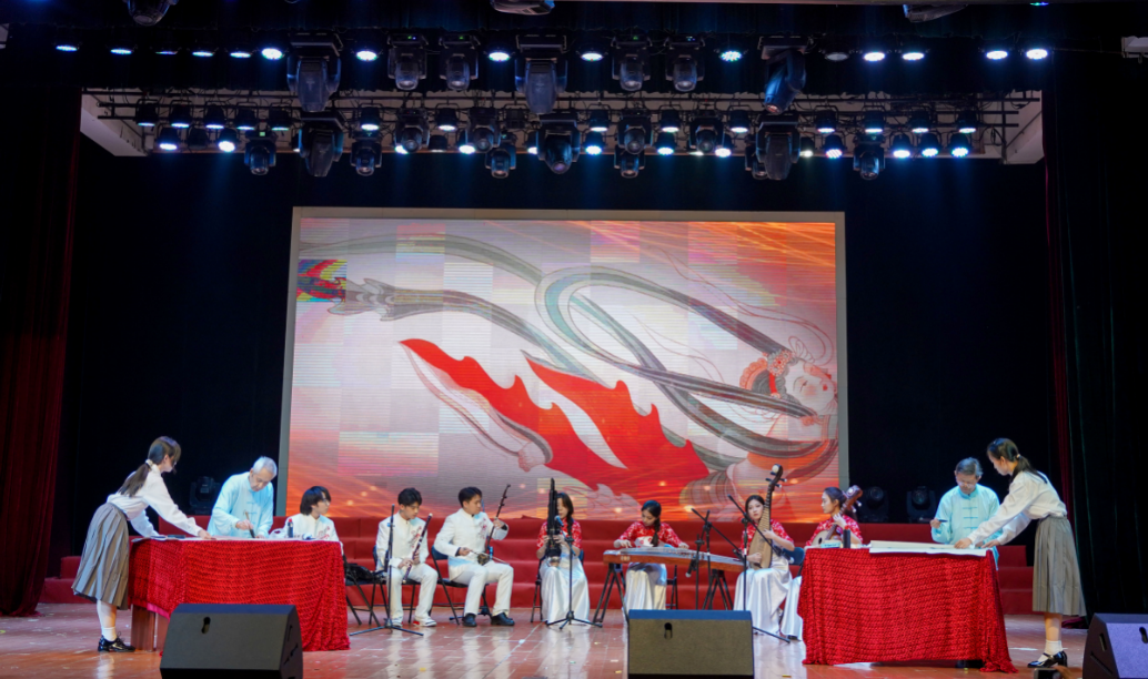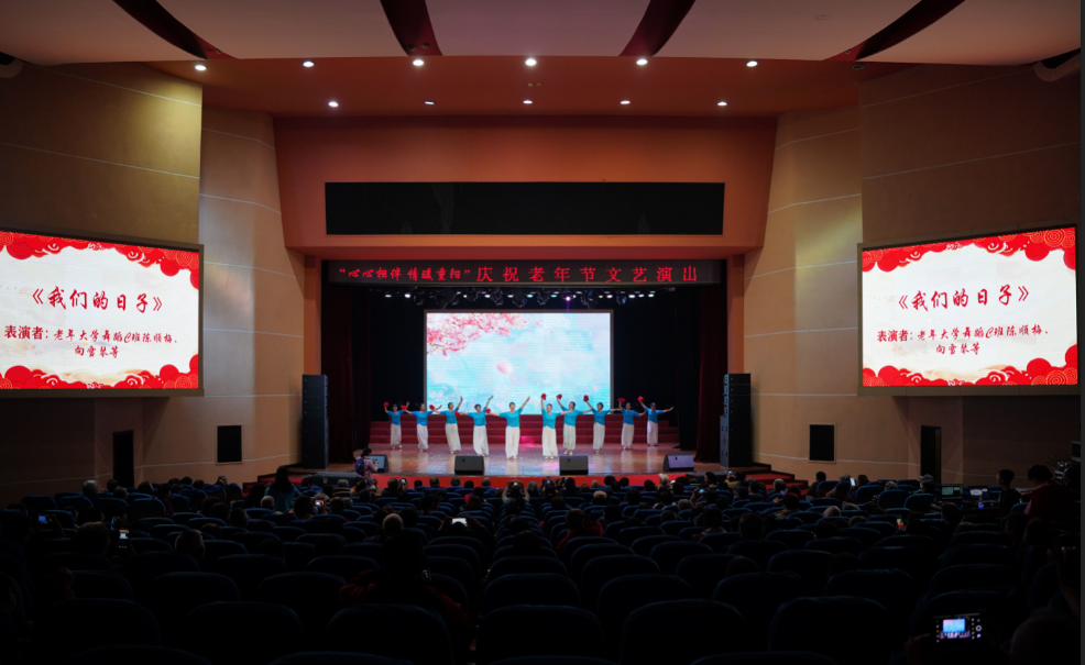 表彰大会结束后,庆祝老年节文艺节目精彩上演。婉转动听的大合唱《时间都去哪儿了》《远情》拉开了文艺演出的序幕。女生小合唱《节日欢歌》、男女生二重唱《我和我的祖国》、器乐合奏《我的祖国》《我们的生活充满阳光》深情演绎了老同志们的赤子情怀,展现了老同志老有所乐的幸福生活。或优美动人、或热情欢快的舞蹈《牧羊姑娘》《茉莉花》《春天的芭蕾》《我们的日子》《共圆中国梦》,反映了老同志们积极向上、乐观进取的精神风貌。充满活力、优雅潇洒的柔力球《百年启航》和《我有我的青春》时装秀表演,展示出老同志老当益壮、健康生活的正能量。大学生表演的快板《春晖照桑榆,快板庆重阳》,表达了当代大学生关爱老人的温暖情谊。伴随着学生优雅动听的民乐合奏《敦煌新语》,两位老同志现场书写了“音韻和谐、欢庆重阳”“凤舞鹤鸣、琴韵书声”两幅书法作品,表达了同庆佳节的喜悦心情。