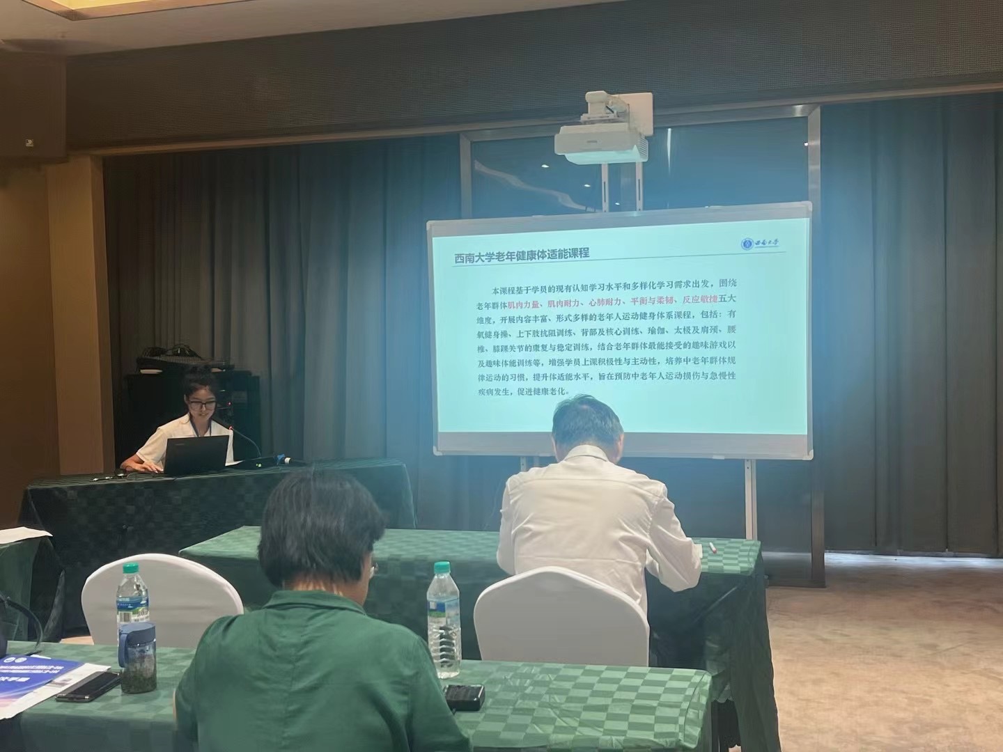 本次会议还对各单位选送的精品课程进行了评选,经参赛单位汇报展示和专家评审,我校程艾洁老师的《老年健康体适能》课程凭借兼具科学与实用的内容,趣味生动的授课方式,获得与会评审专家的一致好评,最终荣获精品课程二等奖。会议期间,本课程获得多所高校老年大学关注,竞相表示希望学习借鉴并开办该课程,这为我校老年大学工作提供了一次很好的宣传机会。