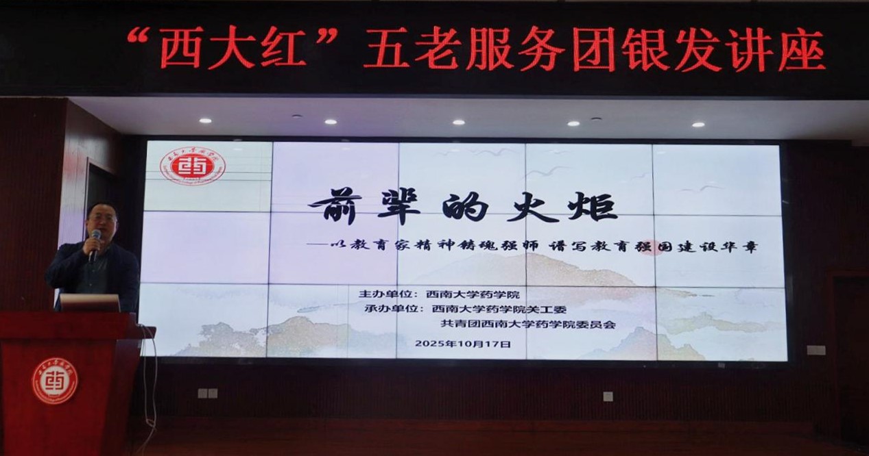 讲座伊始,药学院党委副书记李长松致辞。他指出,学校推进的“西大红”五老服务团“银发讲堂”与“前辈的火炬”系列活动,既是弘扬尊师重教传统的载体,也是师生深度对话的平台,希望全体青年学子能汲取前辈经验、明晰职业方向、树立正确的价值观。