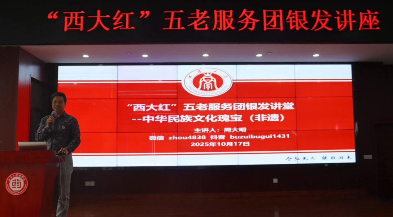 为拓宽学生学术视野,激发多学科探索兴趣,助力其综合素质全面提升,10月17日,学校关工委副秘书长、“西大红”五老服务团引航服务部部长周大明以“中华民族文化瑰宝”为主题,为药学院学生深度解读中外优秀传统文化及非遗魅力。