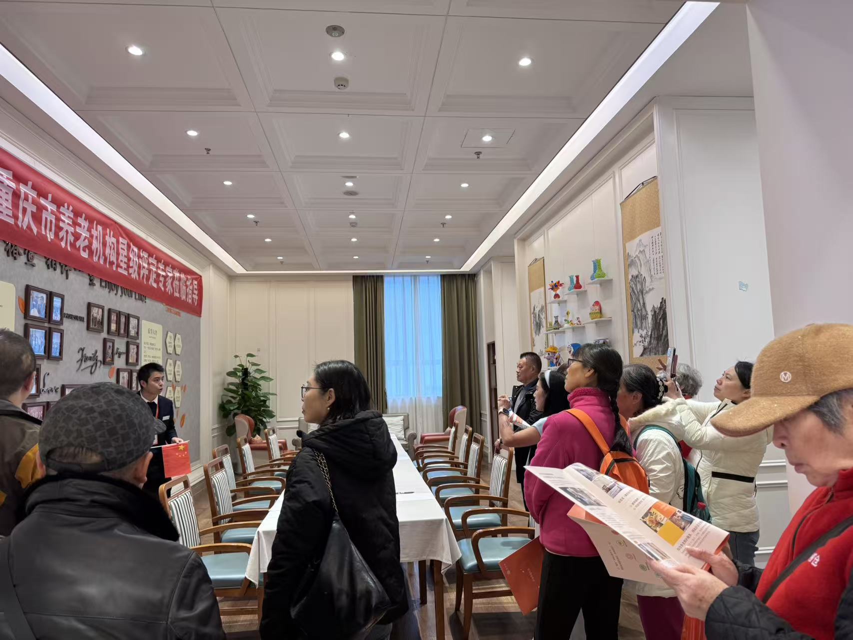 老同志们首先来到位于两江新区的椿萱茂养老公寓(园博园店)。在工作人员的引导下,大家认真听取了关于康养理念与服务内容的详细介绍,依次参观了活动室、多功能厅、样板间等功能区域,全面了解医疗护理、餐饮服务、收费标准、交通安排、家属探视等实际问题,切身感受到康养机构在健康管理、康复护理以及文娱生活等方面的专业服务能力,体会到现代养老服务的细致与周到。