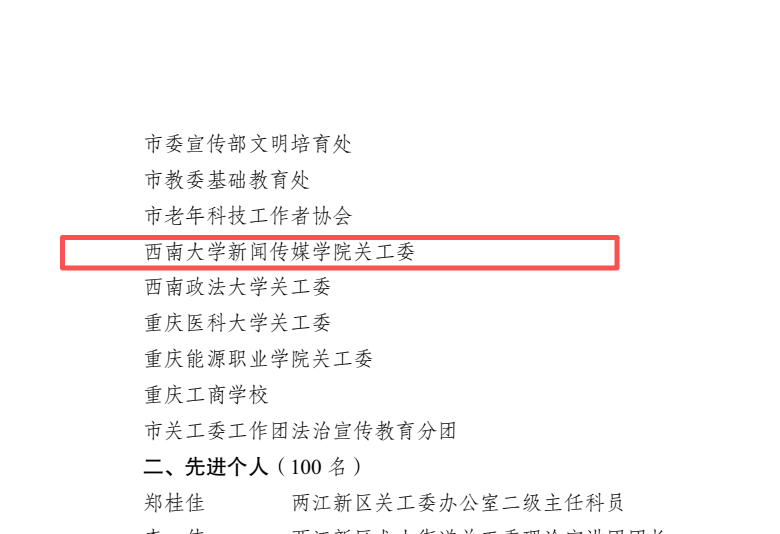 近日,学校新闻传媒学院关工委获评“重庆市关心下一代工作先进集体”,这既是对该学院关工委长期以来深耕青少年育人工作的高度肯定,也为学校关工委推进二级学院(部)基层“五好”关工委建设树立了鲜明标杆,更生动彰显了学校关工委统筹引领、精准赋能二级学院(部)关工委工作的扎实成效。