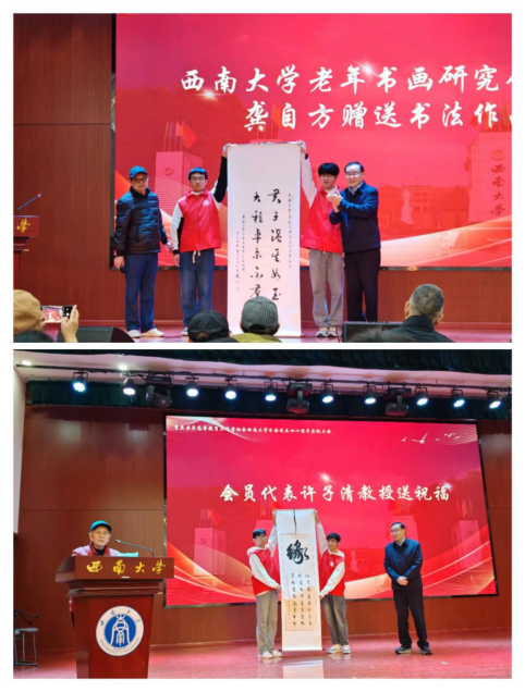 图一 老年书法研究会会长龚自方赠送字画作品 图二 会员代表许子清教授赠送字画作品