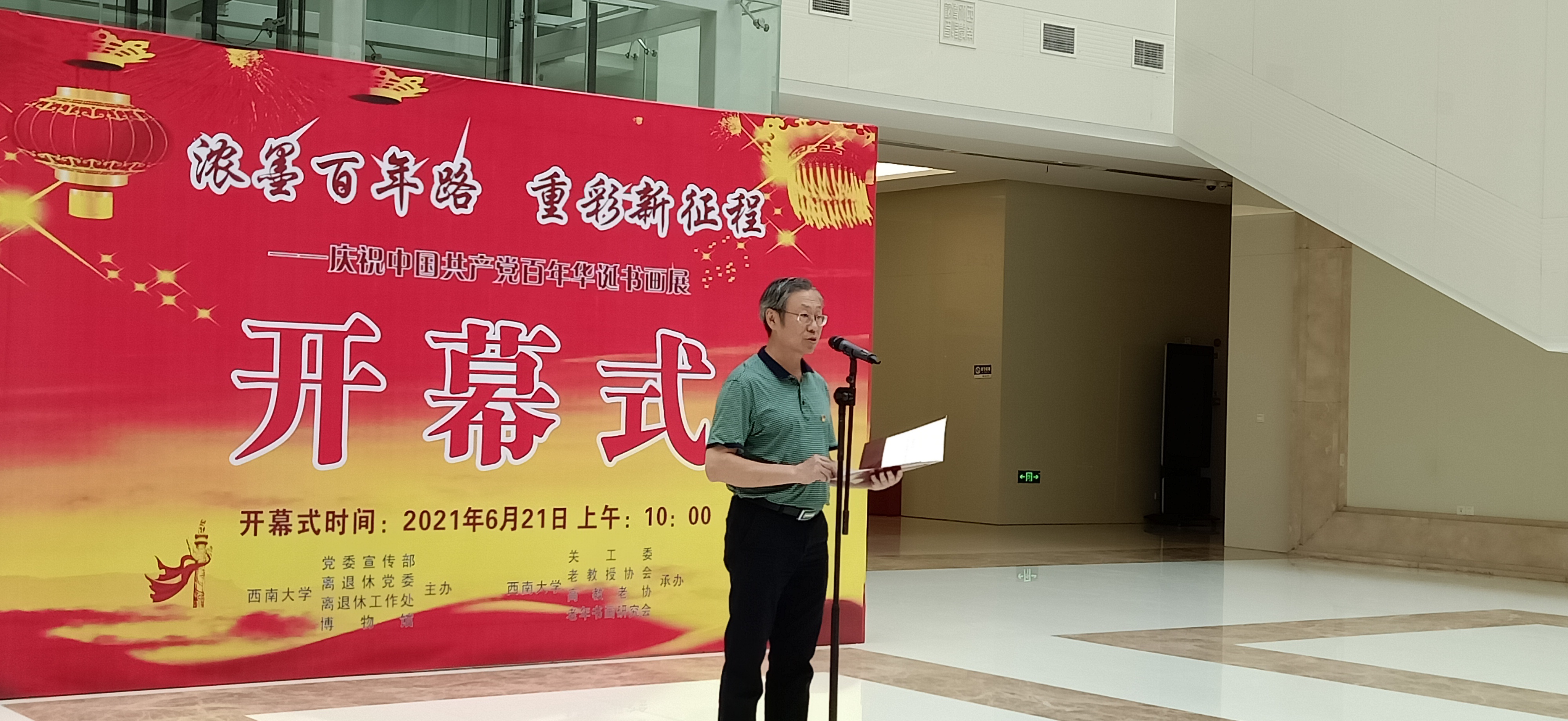 为庆祝中国共产党成立100周年,6月21日,学校在博物馆举行“浓墨百年路 重彩新征程——庆祝中国共产党百年华诞书画展”开幕式,学校党委副书记安春元出席开幕式并致辞,学校党委常委、宣传部部长李荣华,北碚区政协原副主席、北碚区老年书画研究会原会长刘辉,重庆市老年书画研究会原会长彭邦兴等有关职能部门负责人、嘉宾及学校老年书画研究会会员代表参加开幕式。