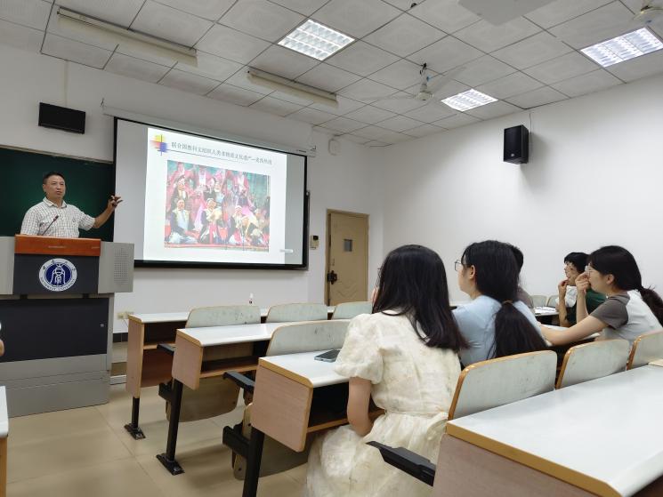 周大明教授以深厚的学术底蕴引领青年学子深入探索中华非物质文化遗产的博大精深,从新疆的麦西热甫到蒙古族的呼麦,从侗族大歌到藏族的唐卡,从国粹京剧到地方戏曲越剧、黄梅戏,再到民间技艺抖空竹,全面而细致地阐释了这些非物质文化遗产项目的历史渊源、艺术特色与当代价值,激发青年学子对传统文化的热爱与传承使命感。